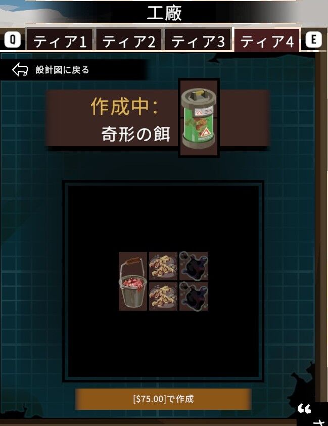 [2]工廠 項目 ティア4にて奇形の餌(多め。私の場合は10個以上必要になりました)が必要になります。餌について↓