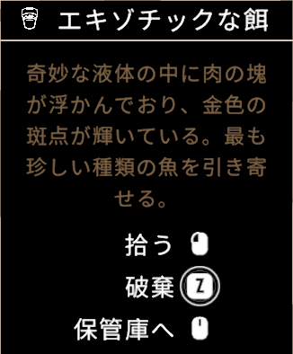 ダークスプラッシュ×2、腐れ×2、ミックス餌×1腐れ集めはゲールクリフ:モトアカウオ、ステラーベイスン:オニキンメ